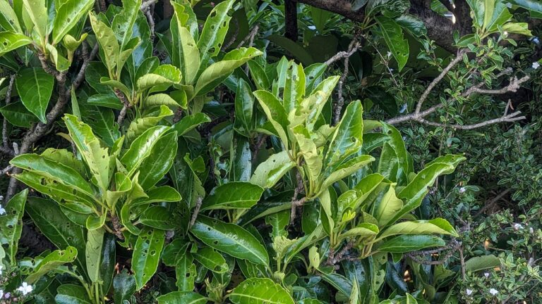 まず、今回のように幼虫が葉を食害します。写真には1匹しか映っていませんが、卵が100~300個産み付けられることからわかるように、幼虫も1匹見つけたら、実際はかなりの量が存在すると考えた方がいいでしょう。幼虫も小さいときは集団で行動し、食害も針葉の片側だけを摂食するため、部分的に葉が褐変します。幼虫は集団で発生する上に、大きくなるにつれて食害する量がどんどん増えていきますので、短期間で葉が大きな被害を受けます。気づいたらほとんど葉がなくなってしまったというような、状況になることが多いです。