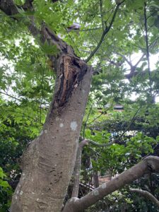 大切な庭木にキノコが生えた。よく見るとサルノコシカケ。樹木にキノコが出ていたら危険信号です。とくにサルノコシカケは庭木を枯死させてしまい、倒木の危険性が高い症状です。詳しくは他のブログ「樹にサルノコシカケがあるけど問題ない?」を参考ください。